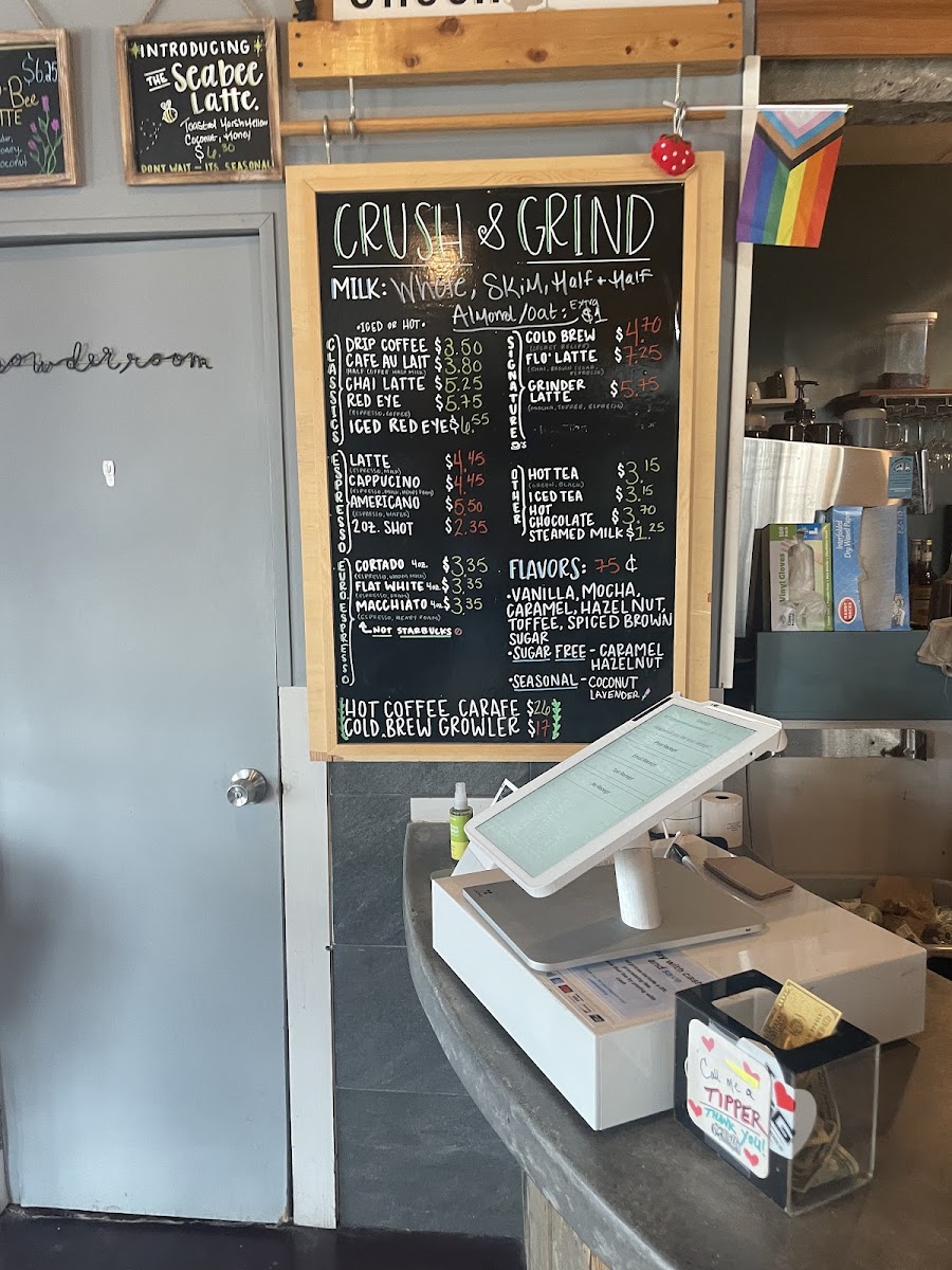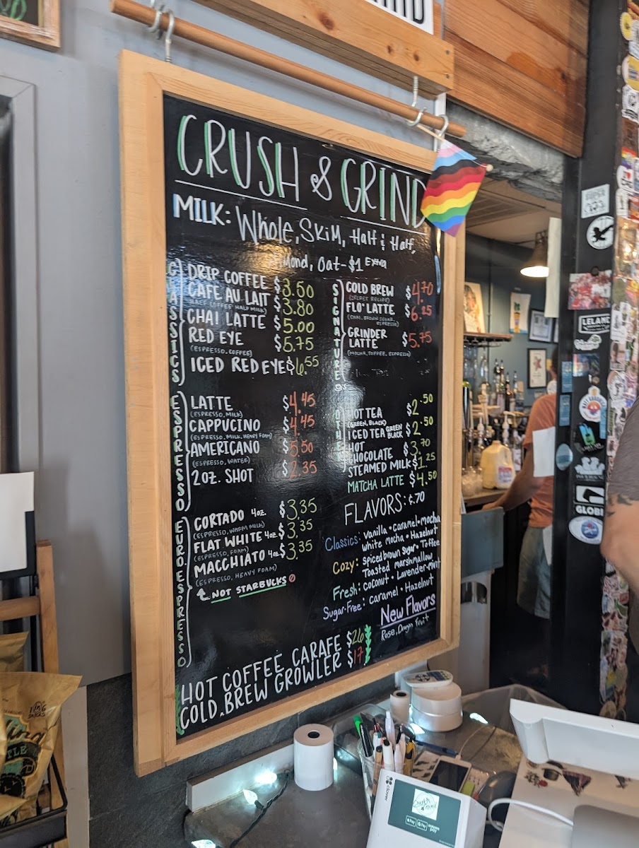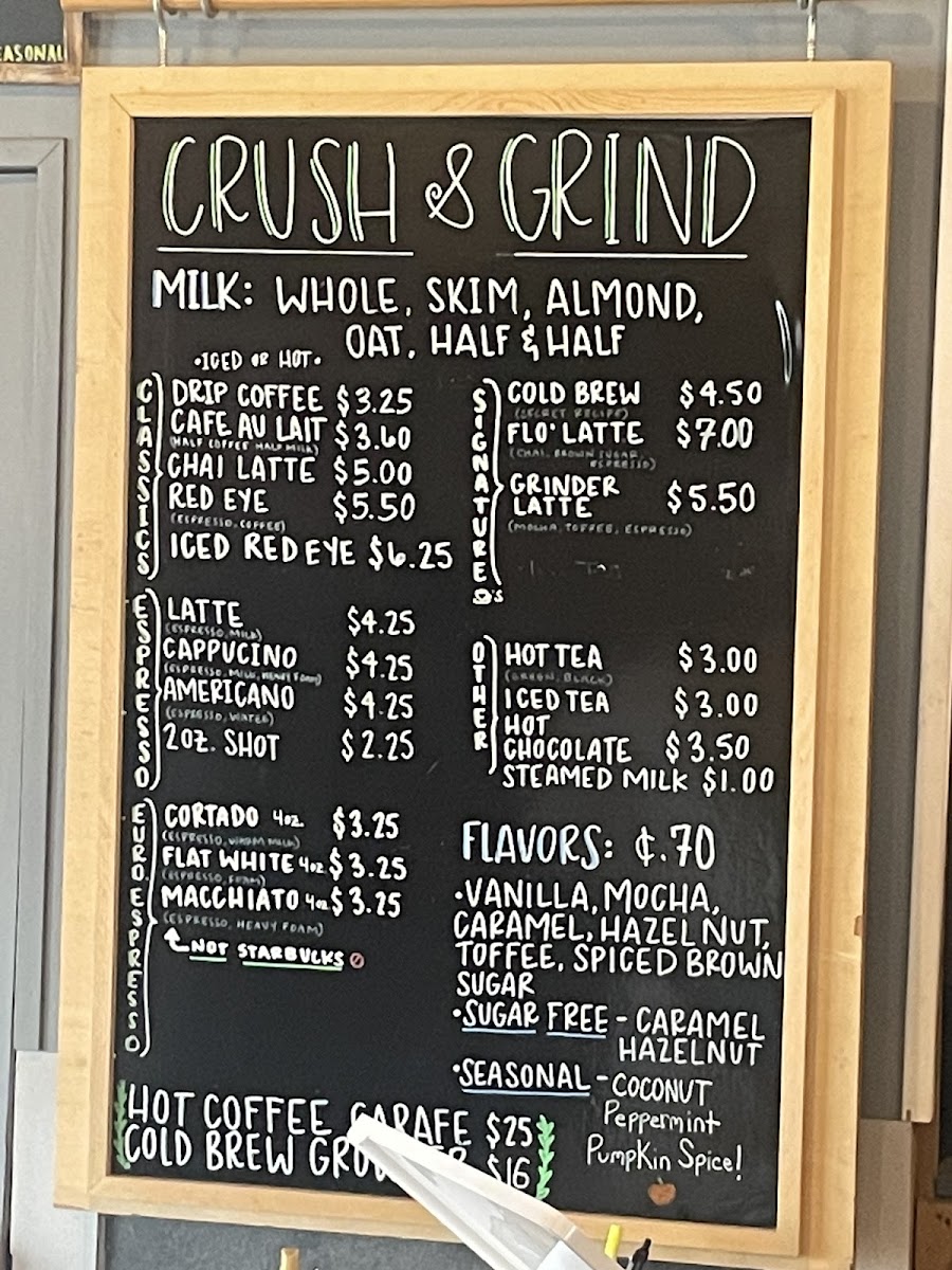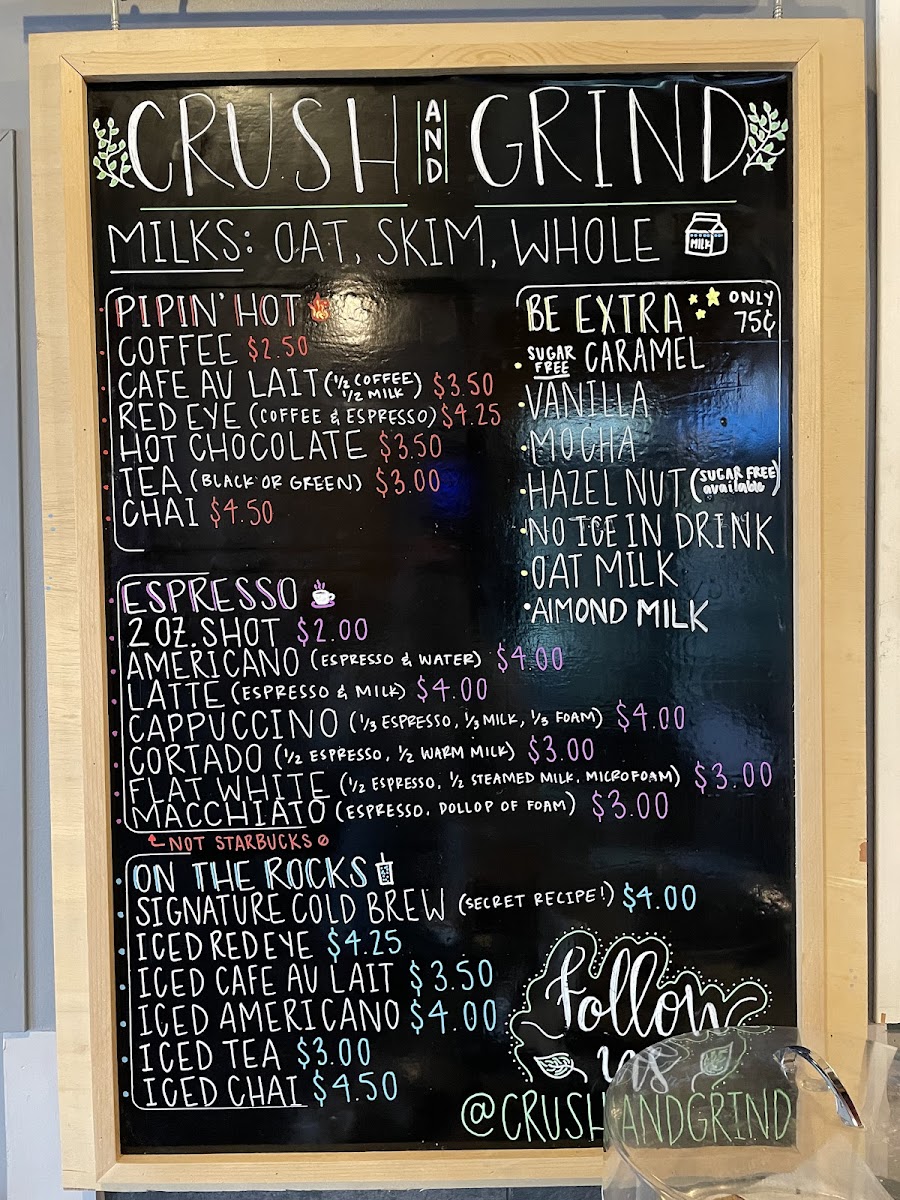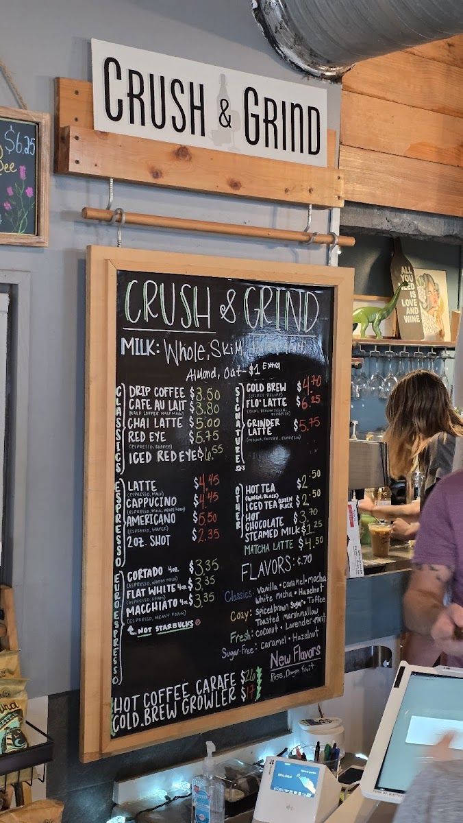 Crush and Grind offers a thoughtfully curated menu that blends the simplicity of a neighborhood coffee shop with the inviting charm of a wine bar. Whether you're stopping by for your morning espresso or settling in for a casual evening drink, the menu suits a variety of moments throughout the day.