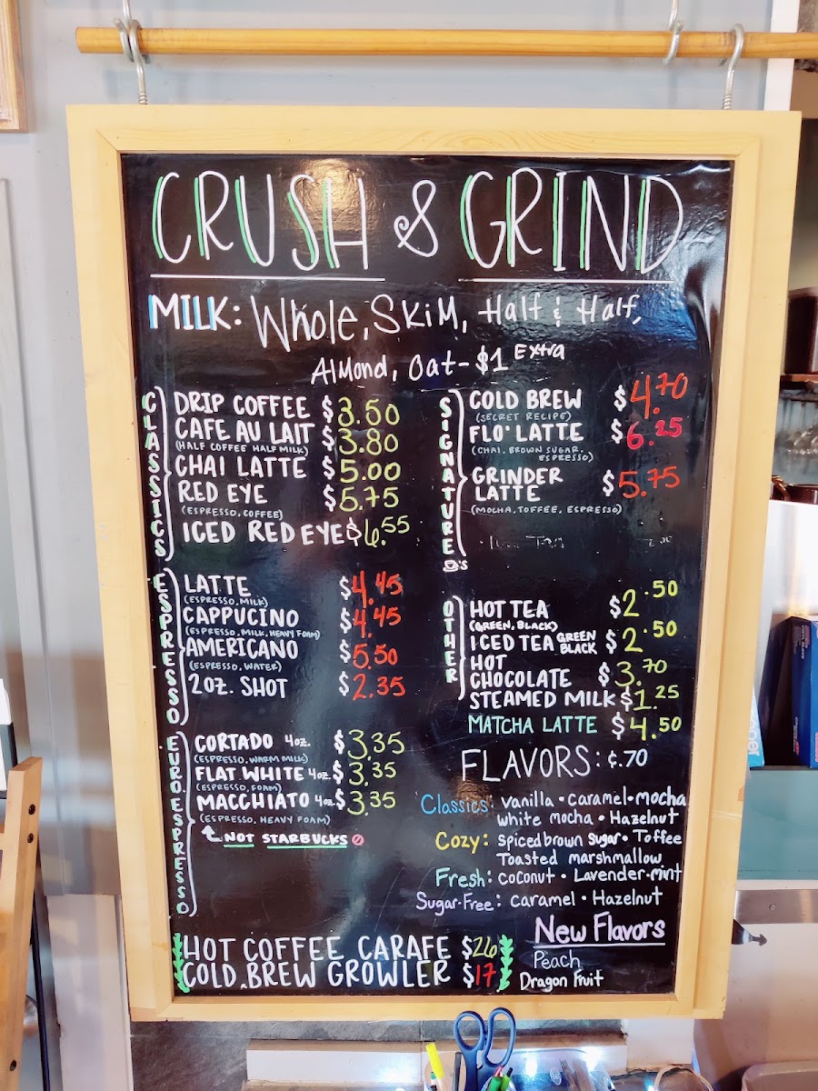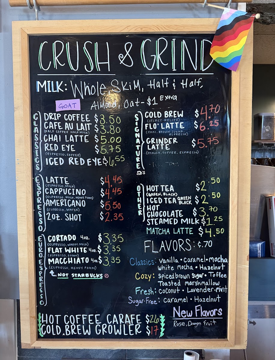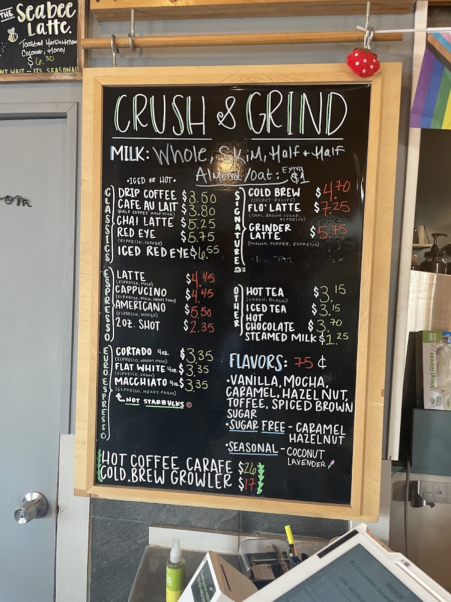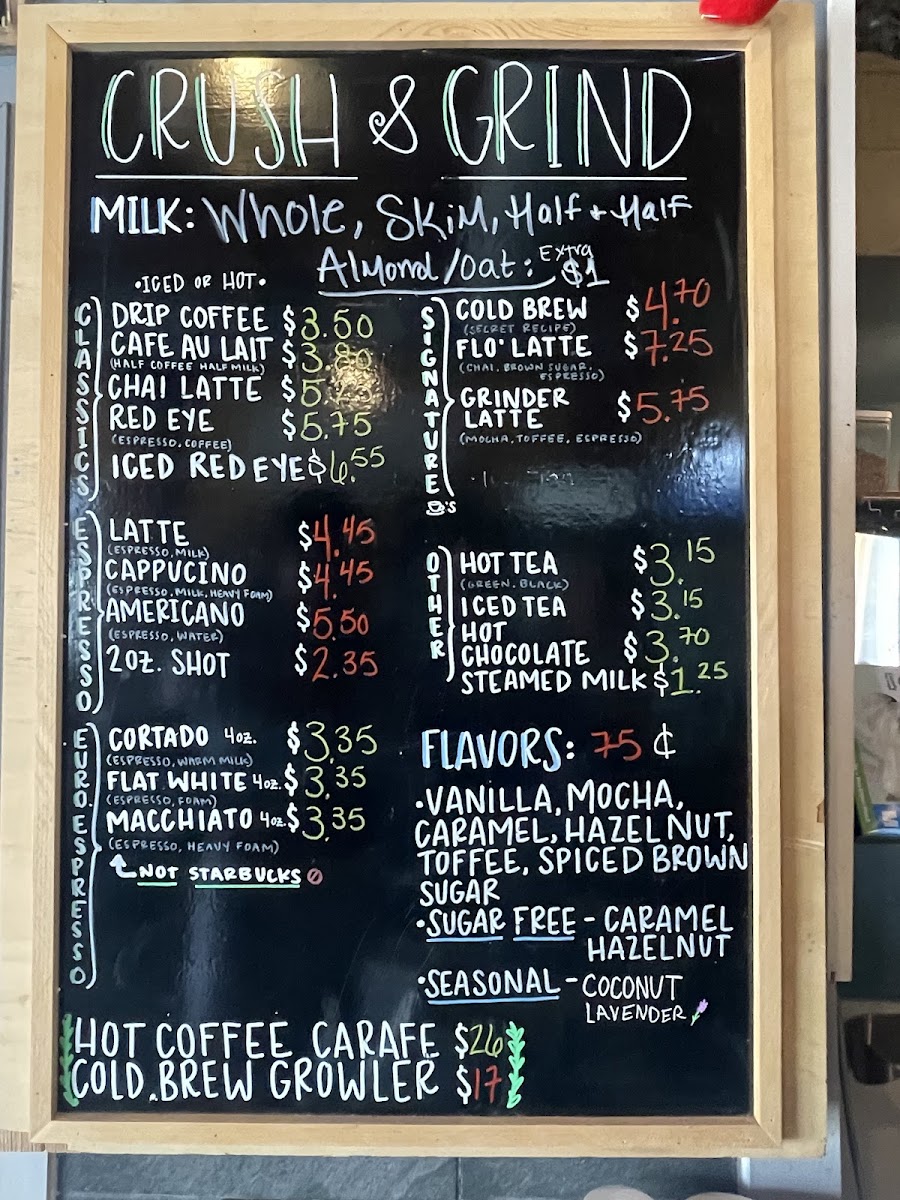 Crush and Grind offers a thoughtfully curated menu that blends the simplicity of a neighborhood coffee shop with the inviting charm of a wine bar. Whether you're stopping by for your morning espresso or settling in for a casual evening drink, the menu suits a variety of moments throughout the day.